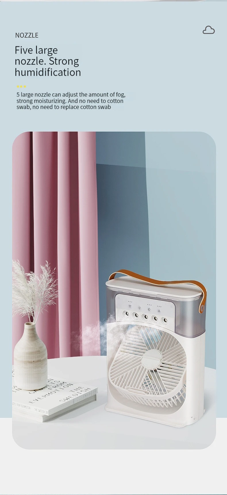 Selling points: 3 gears, 5 spray holes, 6-inch fan with large air volume, 600ml water storage tank, adjustable colorful night lights, and timing when starting.